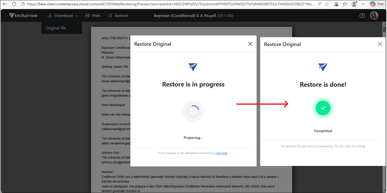 When you decide to restore the file from the preview, the Restore in progress window appears, followed by Restore is done! once the process is complete. After closing the preview, the file will be available again in Teams with its original format.