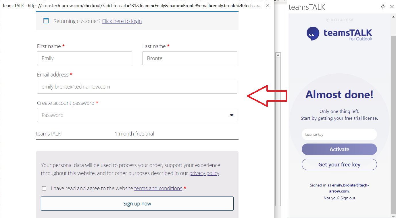 If you don't have a license key, click on the "get your license key" button. The free license requires registration into the TECH-ARROW store. The registration requires a username (which will be automatically prefilled with your O365 email address) and a password. The password can be anything, but make sure to remember it. Also, it is not recommended to use the same password in two/multiple places, so we suggest using a different password from the O365. After the registration, agree with the terms and start your trial or go to the store and buy the version you need. You can also manage your license key and subscription on the License Management page.