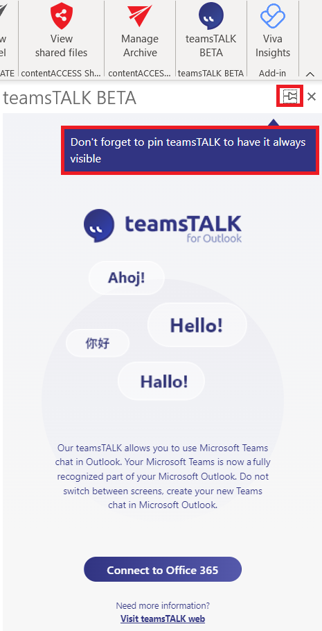 Find the downloaded app on the toolbar. Click on the icon and open it. If you pin the teamsTALK add-in, the app will be opened automatically the next time you open Outlook. Also, it is highly recommended to pin the app, so it will not hide when a different email is opened.